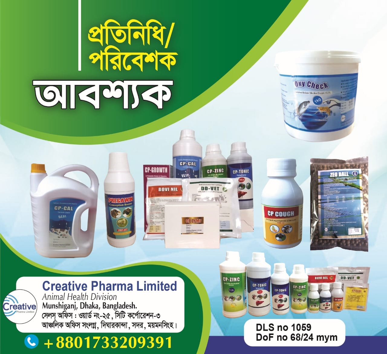 Creative pharma limited এর সকল প্রকার গবাদি প্রাণির আমদানিকৃত পুষ্টি প্রিমিক্স সারাদেশে বিপণন এর জন্য সারা বাংলাদেশে ডিলার নিয়োগ চলছে ডিলারশীপ কিংবা হোলসেলের জন্য সরাসরি যোগাযোগ করুন : ক্রিয়েটিভ ফার্মা লিমিটেড DLS no-1059 DoF no 68/2024 দীঘার কান্দা আঞ্চলিক অফিসের বিপরীতে সদর ময়মনসিংহ । কন্ট্রাক্ট নাম্বার: 01733209391